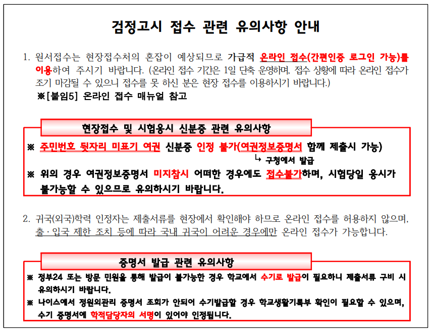 외국 학력 인정자는 현장 접수만 가능하나, 출입국 제한조치 등으로 현장 접수를 할 수 없는 특별한 경우에는 온라인 접수가 가능하다. 이 경우 원본 서류를 반드시 ‘서울특별시교육청 평생교육과’로 등기 발송(6월 21일(금) 발송분까지) 해야 인정된다.