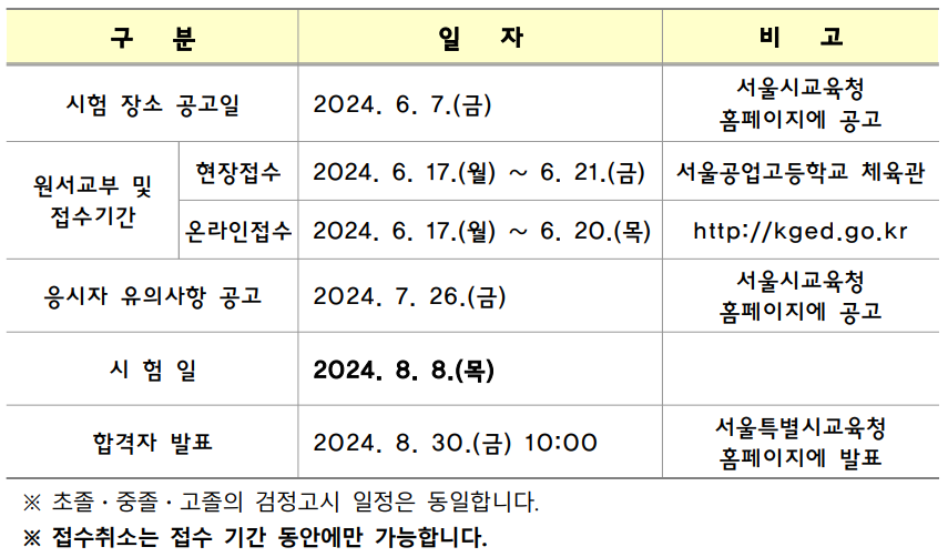 검정고시 응시원서 현장 접수는 서울공업고등학교(동작구 소재) 체육관에서 6월 17일(월)부터 21일(금)까지 오전 9시부터 오후 6시까지이고, 온라인은 ‘나이스 검정고시 대국민서비스’를 통해 6월 17일(월)부터 6월 20일(목) 오후 6시까지 접수하면 된다.