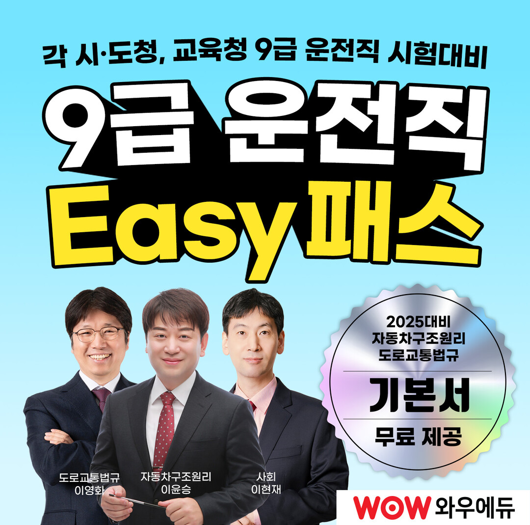 한편 와우에듀에서 2025년 9급 운전직 공무원 시험에 대비할 수 있는 ‘운전직 합격패스’를 선보였다. 2025년 운전직 공무원 시험에 합격할 수 있도록 도로교통법규 과목의 법률개정사항과 전국 출제경향을 모두 반영한 새로운 강의와 신규 교재를 선보이며, 자동차구조원리 또한 2025년 합격을 위한 새로운 강의를 제공한다.