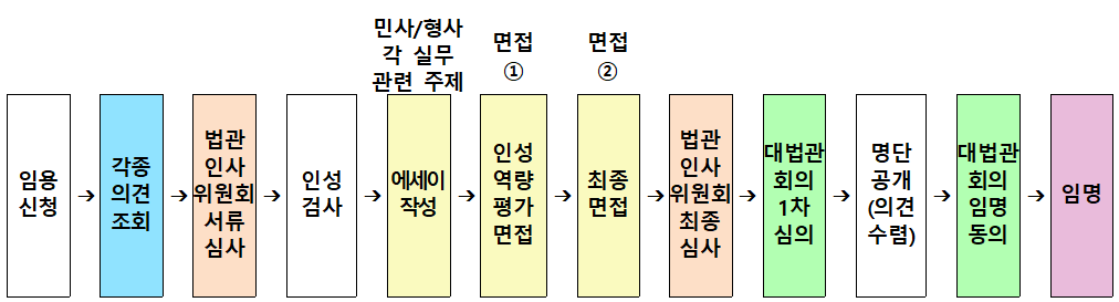 임용 절차는 크게 서류심사 → 인성검사·에세이 → 역량면접 → 최종면접 → 대법관회의 동의 순으로 진행된다.