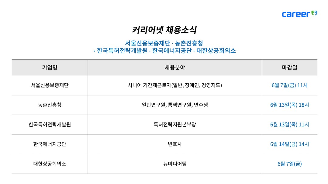 커리어넷은 3일 서울신용보증재단, 농촌진흥청, 한국특허전략개발원, 한국에너지공단, 대한상공회의소 등의 채용 소식을 전했다.