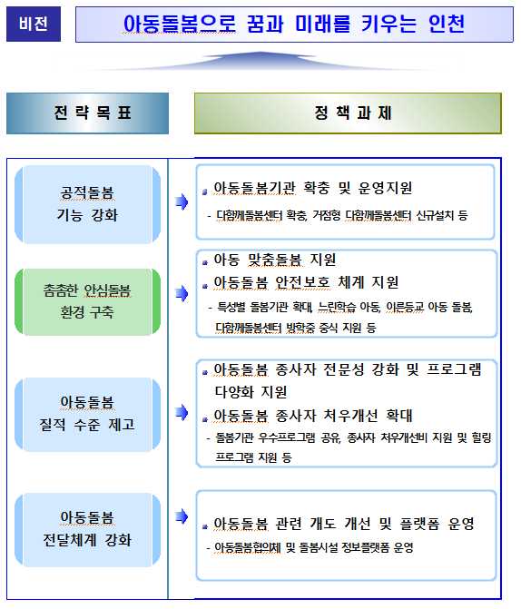 주요 전략목표로는 ▲공적돌봄 기능강화 ▲촘촘한 안심돌봄 환경 구축 ▲아동돌봄 질적 수준 제고 ▲아동돌봄 전달체계 강화가 있다.