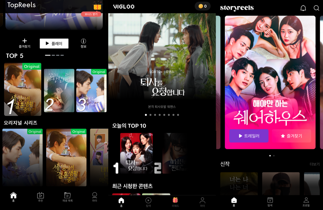 대표적인 플랫폼으로는 ‘Topreels(탑릴스)’와 ‘Vigloo(비글루)’가 있으며, 지난 9월에는 왓챠가 ‘Shortcha(숏챠)’를 선보였고, 10월 17일에는 띵스플로우가 ‘StoryReels(스토리릴스)’를 론칭한 바 있다.