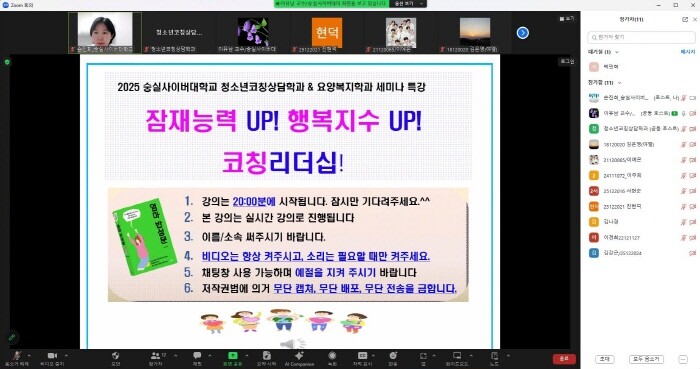 ▲사진=숭실사이버대학교 청소년코칭상담학과에서 진행한 ‘코칭 리더십-잠재능력 UP, 행복지수 UP!’ 특강, 숭실사이버대 제공