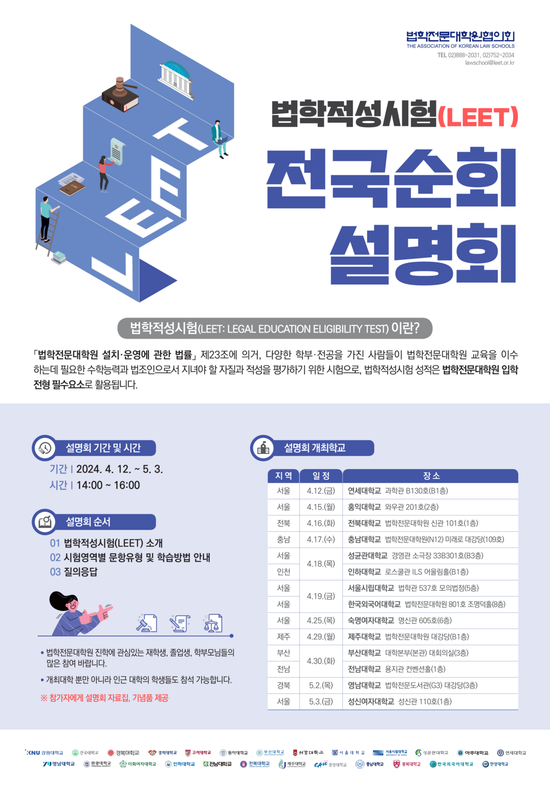 법학전문대학원협의회(이사장 이상경)는 오는 12일(금)부터 5월 3일(금)까지 전국 14개 대학을 직접 찾아가서 법학적성시험(LEET) 설명회를 개최한다고 2일 밝혔다.