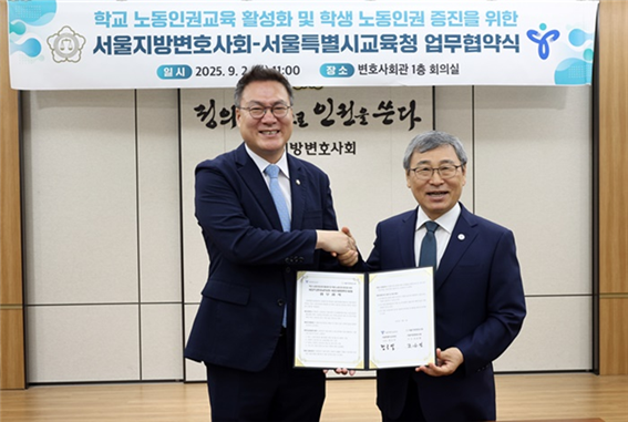 [피앤피뉴스=마성배 기자] 서울지방변호사회(회장 조순열)와 서울특별시교육청(교육감 정근식)이 학생들의 노동인권 보호와 학교 현장의 교육 활성화를 위해 협력에 나섰다. 9월 2일(화) 오전 11시, 변호사회관 1층 회의실에서 ‘학교 노동인권교육 활성화 및 학생 노동인권 증진’을 위한 업무협약(MOU)을 체결했다.