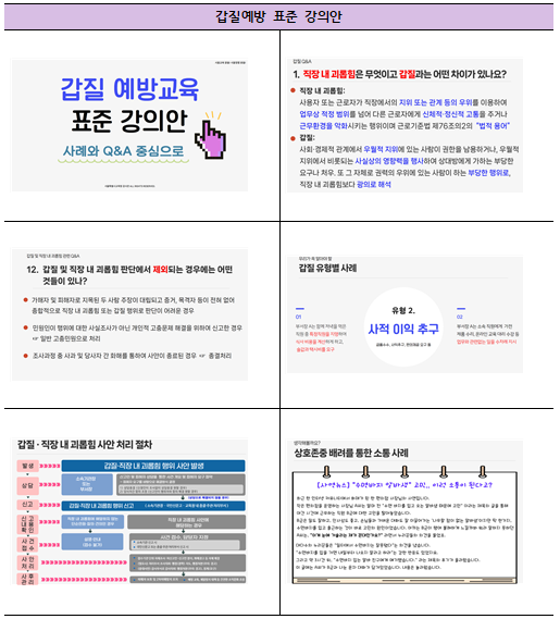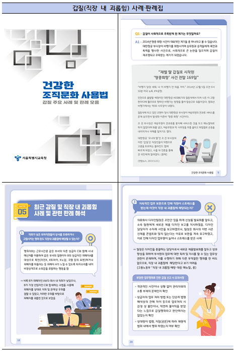 갑질 사례·판례집은 실제 현장에서 발생 가능한 상황을 바탕으로 제작되었으며, 문제 해결뿐 아니라 배려와 존중이 중심이 되는 조직문화를 조성하는 데 기여할 것으로 기대된다.