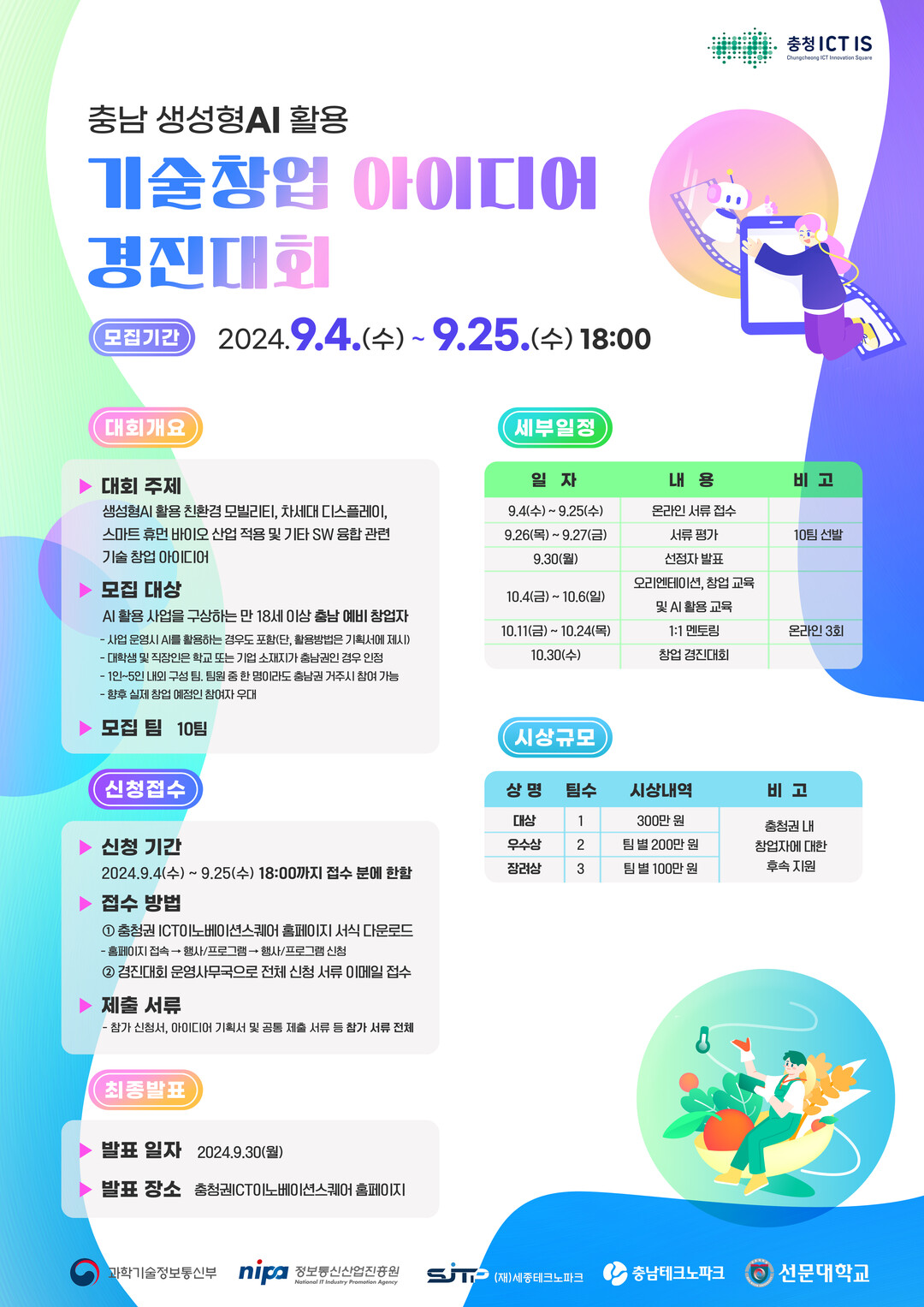 이번 경진대회는 충남지역 기술창업에 대한 인재 발굴 및 역량 강화를 도모하고, 혁신적이고 도전적인 생성형 AI 활용 기술창업 아이디어를 발굴하여 창업 문화를 확산시키기 위해 개최되었다.