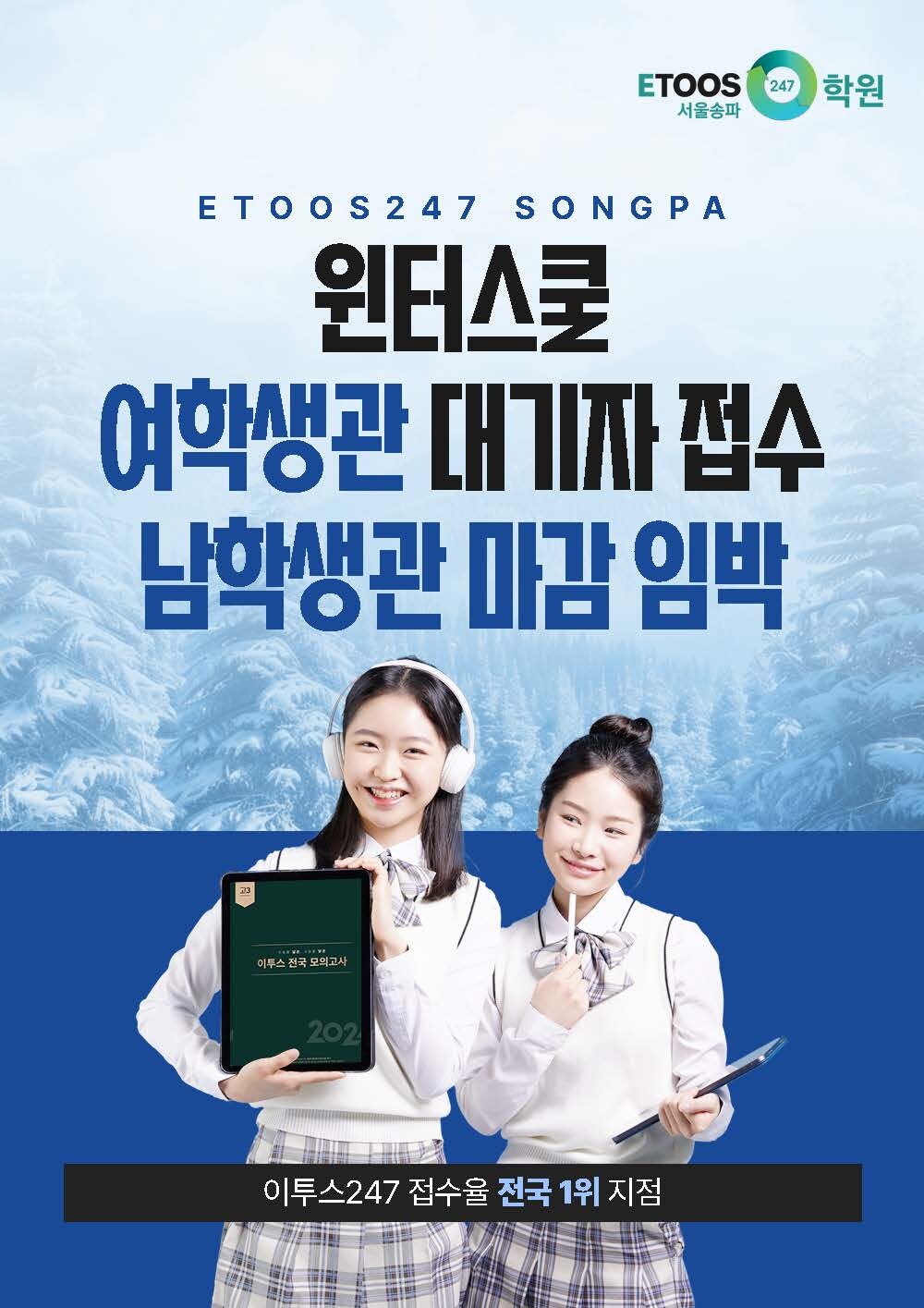 관련해 잠실독학재수학원 이투스247학원 송파점은 2026 윈터스쿨을 운영해 수험생들을 지원하겠다고 밝힌 바 있다. 현재 여학생반은 등록이 끝나 대기자만 받고 있으며, 남학생반도 등록 마감이 임박한 상황이다.