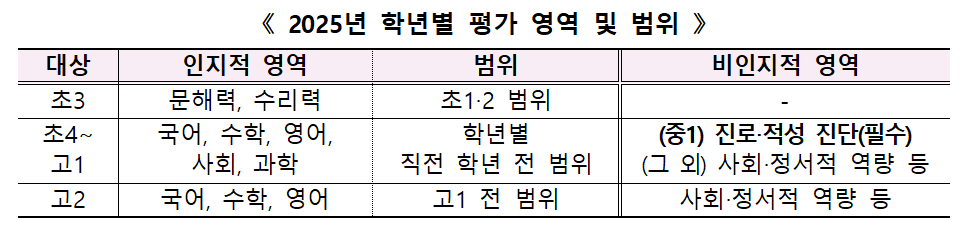올해 평가에서 가장 주목할 점은 초등 4학년과 중학교 2학년이 평가 대상에 포함되면서 전 학년(초3~고2)을 아우르는 체계적 학업 진단이 가능해졌다는 점이다.