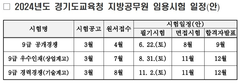2024년도 경기도교육청 지방공무원 임용시험을 준비하는 수험생들의 편의를 도모하고자 시험 일정을 도교육청 홈페이지를 통해 안내했다.