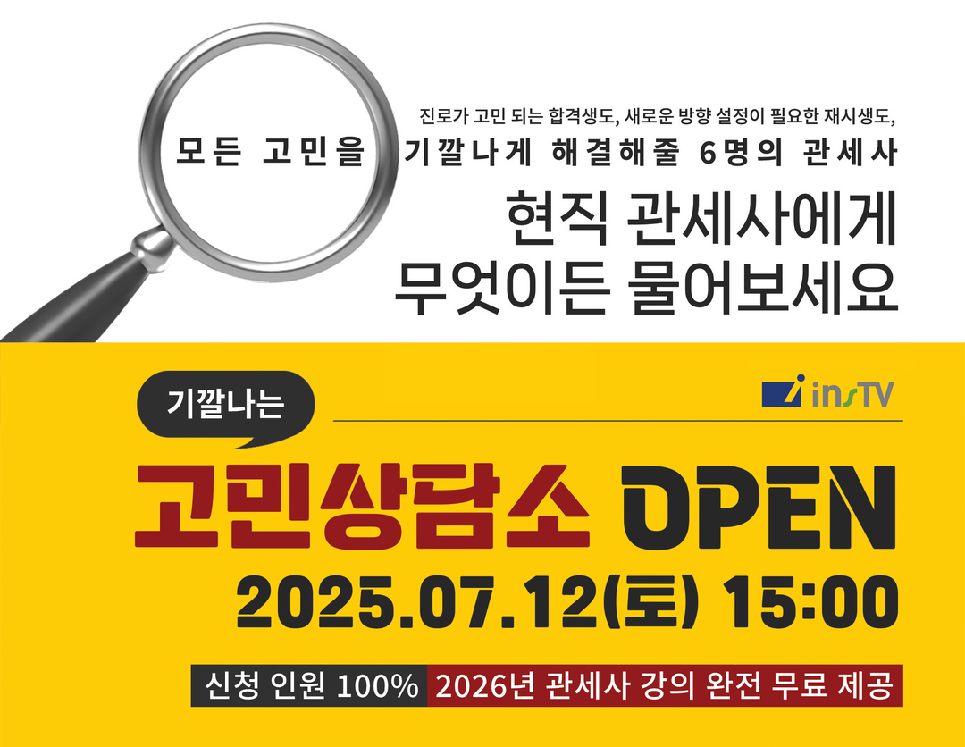 다가오는 7월 12일(토) 대한민국 1등 금융·보험전문교육원 인스티비가 미래 관세사를 위한 고민상담소를 운영한다. 해당 상담소에는 진로가 고민되는 합격생도, 새로운 방향 설정이 필요한 재시생도 모두 참여할 수 있다. 또한 참여한 모든 사람에게 2026년 관세사 강의 전체를 무료로 수강할 수 있는 혜택이 주어진다.