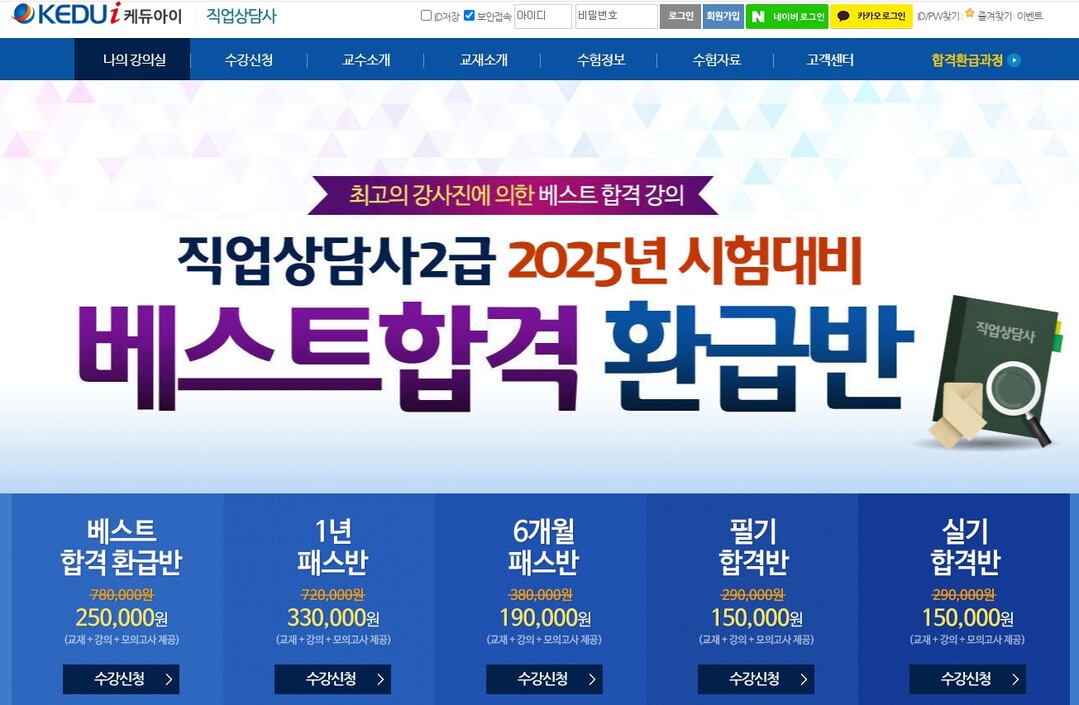 케듀아이에서는 베스트합격반을 통해 수강생들에게는 2025년 개정판으로 출간한 권문찬 교수의 직업상담사2급 한권으로 끝내기 1권, 직업상담사 2급 1차 기출예상문제집, 직업상담사 2급 2차 직업상담실무 1권 포함하여 총 3권과 2025년 변경된 출제기준에 맞춘 기본이론강의 74차시, 문제풀이 43차시, 직업상담실무 18차시를 제공하고 있다. 권문찬 교수의 합격 합격프로그램은 한국일닝협회 잡고를 통해 구직자, 실업자 내일배움카드 국비지원교육으로도 진행되고 있다.