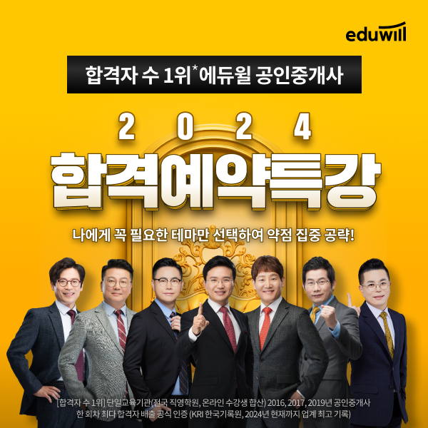 합격 예약 특강은 부동산학개론, 민법, 중개사법령 및 중개실무와 부동산 공법, 공시법, 세법 등 공인중개사 1, 2차 과목별 15명의 교수진의 테마 특강으로 구성돼 있다. 에듀윌 공인중개사 합격 예약 특강 페이지의 테마 특강 맛보기 영상을 통해 구매 전 시청 가능하다.