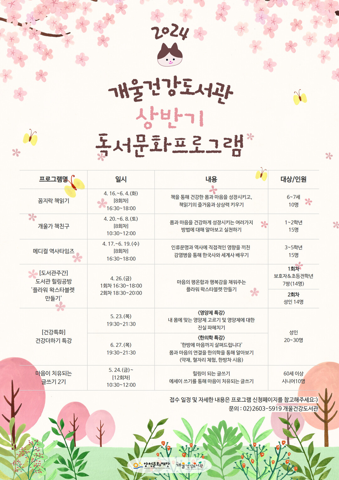 23일에는 개울건강도서관에서 도서관 특화 주제인 ‘건강’에 맞춰 ‘건강더하기+ 특강’을 진행한다. 건강하고 활기차게 인생을 사는 법을 현직 약사가 알려주며, 내 몸에 맞는 영양제 고르기 및 영양제에 대한 진실을 파헤치는 내용을 풀어낼 예정이다.