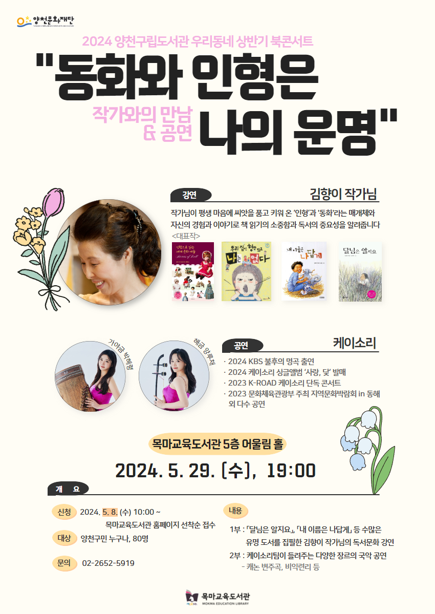 양천구가 준비한 5월 문화행사에 대한 자세한 내용 및 신청 사항은 양천구립도서관 누리집에서 확인 가능하다.