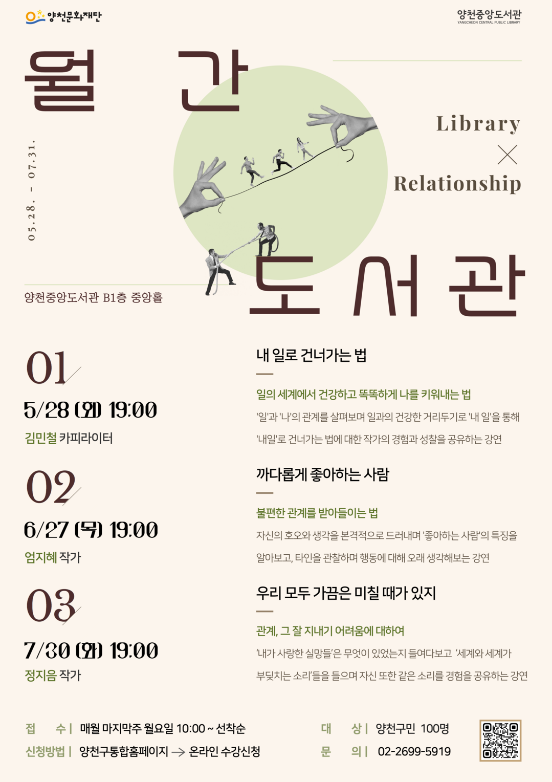 이어 28일은 양천중앙도서관에서 김민철 카피라이터의 ‘내 일로 건너가는 법’ 강연이 준비되어 있다. 일의 세계에서 건강하고 똑똑하게 나를 키워내는 법을 알려주는 강연으로, 일과 나의 관계를 살펴보며 일과의 건강한 거리두기로 ‘내 일’을 통해 ‘내일’로 건너가는 법에 대한 작가의 경험과 성찰을 공유한다.