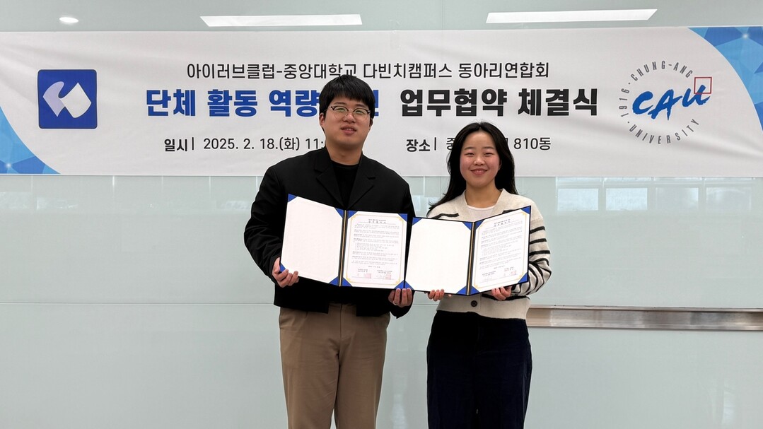 동아리활동 관리 및 기업프로젝트 매칭서비스 ‘아이러브클럽’을 운영하고 있는 ㈜포트존(대표 송준)과 중앙대학교 다빈치캠퍼스 동아리연합회(41대 회장 안하영)가 동아리 활동역량 증진을 위한 긴밀한 협력체계를 구축하여 공동 발전을 도모하고자 18일 자로 업무협약을 체결했다.