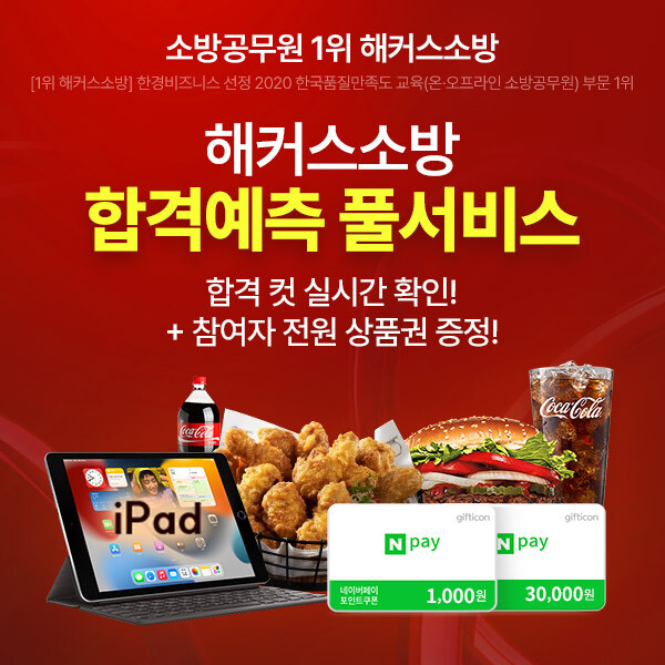 해커스소방은 소방 시험을 본 수험생들을 위한 다양한 이벤트도 제공하고 있다. 시험 당일 ‘합격예측 풀서비스’에서 채점한 전원에게는 네이버페이 1천 원권을 증정하며, 당일 선착순 채점자 500명 전원에게 버거킹 와퍼 세트를 제공한다. 추첨을 통해 교촌 허니오리지날+콜라 세트(*10명), 네이버페이 3만 원권(*3명)을 제공하며, 사전예약 후 풀서비스 참여 완료한 수험생 중 추첨을 통해 아이패드도 제공한다.