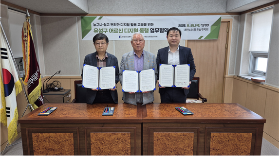 (사)대한노인회 유성구지회와 유성구노인복지관, ㈜이앤오즈는 누구나 쉽고 편리한 디지털 활용 교육을 위한 ‘유성구 어르신 디지털 동행 업무 협약’을 지난 6월 26일 체결했다.