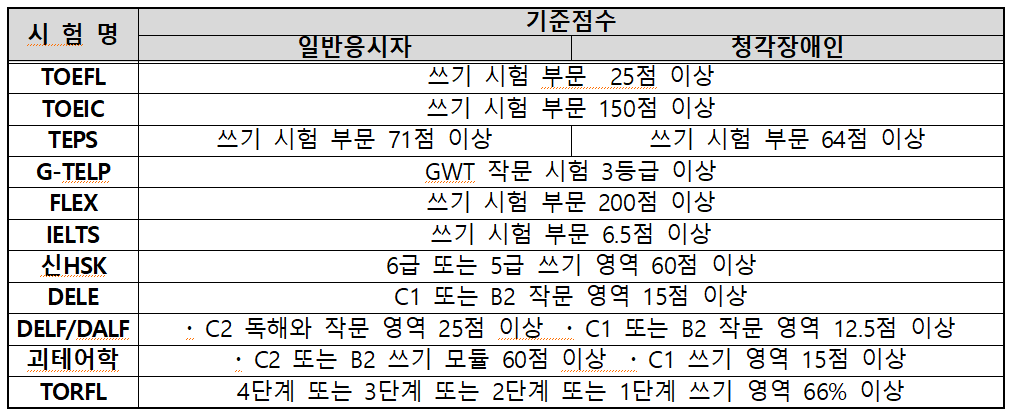 ※ 장애의 정도가 심한 청각장애(두 귀의 청력을 각각 80데시벨 이상 잃은 경우를 말한다. 이하 같다)가 있는 응시자의 경우 듣기부분을 제외한 나머지 부분의 성적 점수를 인정.