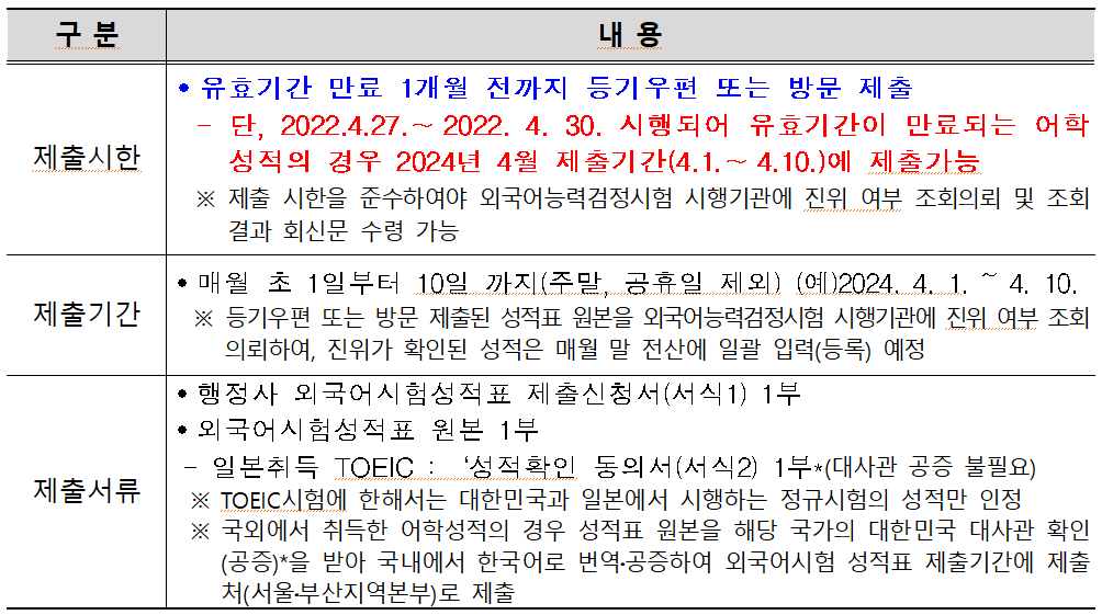 ※ 개정된 시행령 시행(’24.4.27.) 이전에 상기 ‘공인어학성적 인정기준’에 충족하는 성적을 기 제출하여 승인 완료된 경우 추가 제출 불필요