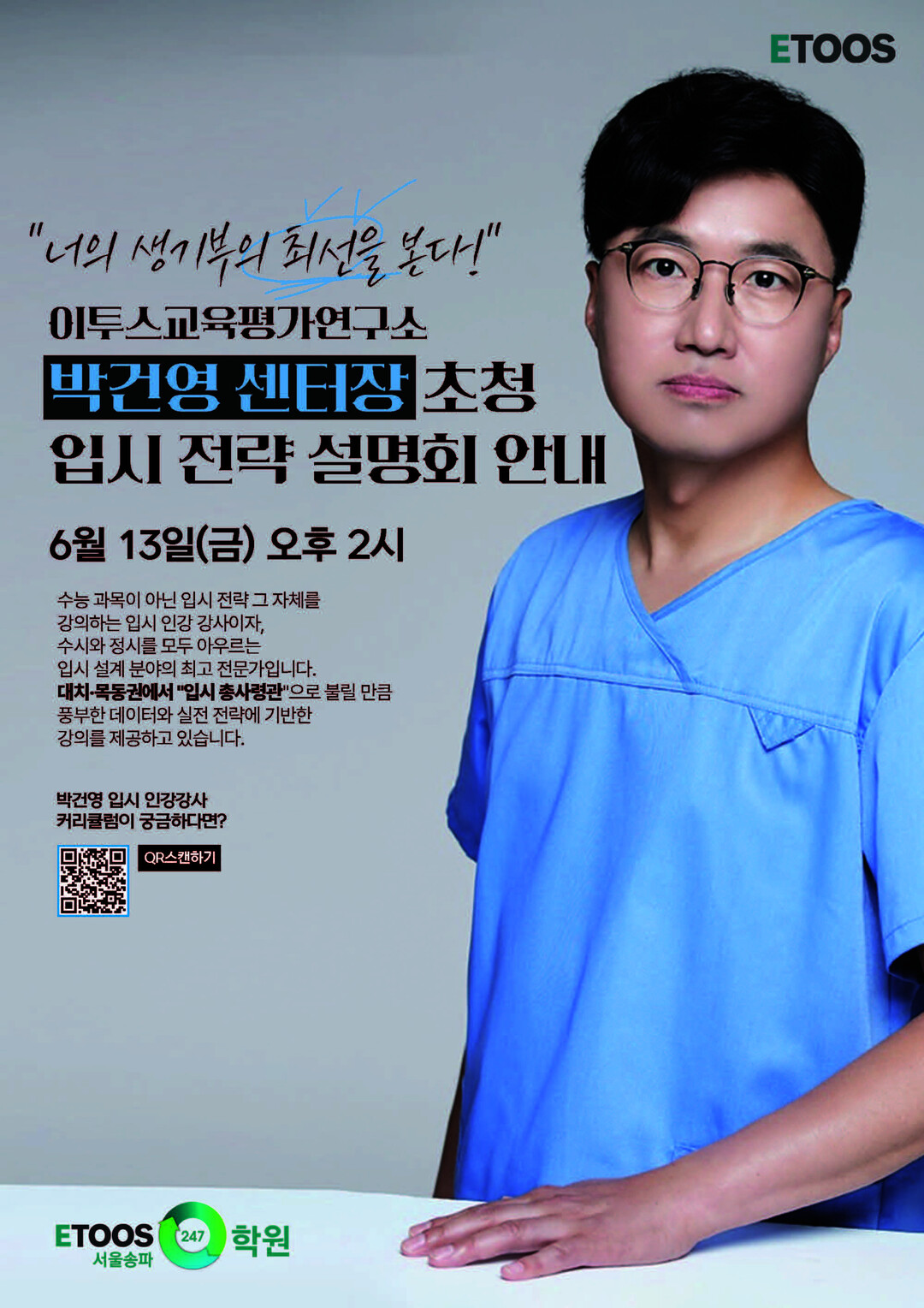 한편, 박건영 센터장이 주도하는 이번 입시 전략 설명회는 이투스247학원 송파점 재원생 모두 참석이 가능하며, 외부 수험생의 경우, 사전 신청 후 내부 확인 절차를 거쳐 참석 여부가 안내된다.
