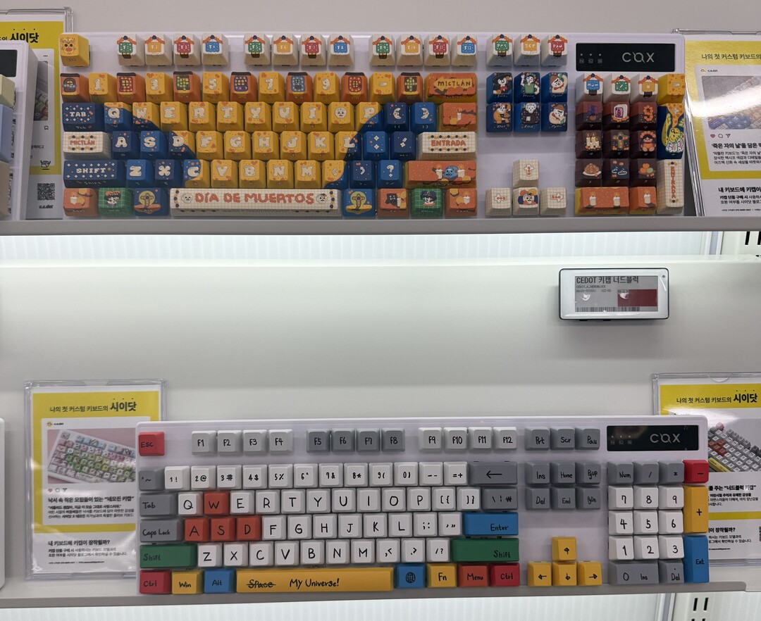 체험 가능한 품목은 키보드에만 그치지 않는다. 다양한 스위치별 타건감(청축·적축·황축)을 비교할 수 있고, 커스텀 키캡을 통한 튜닝도 가능하다. COX의 전통 단청 패턴 키캡부터 레트로, 파스텔, 흑백 톤까지 다채로운 라인업이 전시돼 있어 “구경만 해도 재미있다”는 평가가 나온다.