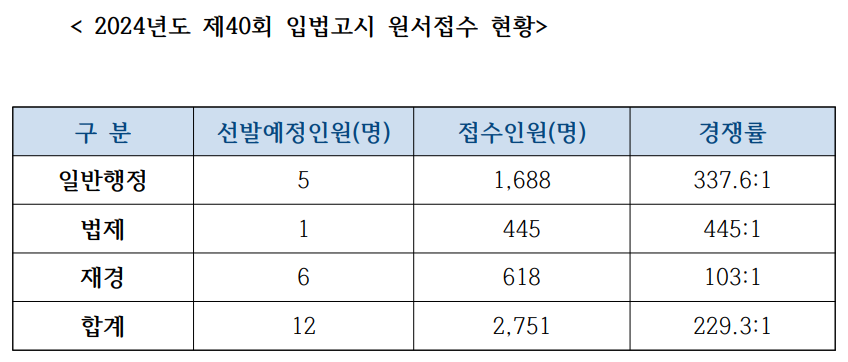 국회사무처는 2024년도 제40회 입법고시 원서접수를 지난 1월 22일부터 29일까지 진행한 결과, 총 12명 선발에 2,751명이 지원하여 평균 229.3대 1의 경쟁률을 기록했다고 2일 밝혔다.