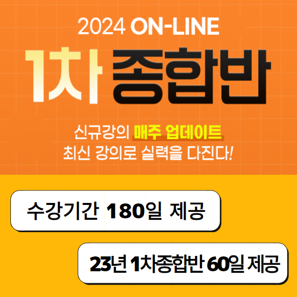 현재 업로드를 위해 신규 강의를 촬영 중으로, ‘온라인 1차 종합반’ 수강 시 23년 온라인 1차 종합반 60일 제공, 선행학습 강의 지원 등 파격적인 혜택이 주어진다. 합격 가이드북, 수험 필기구, 2차 연습장 1부 등 풍성한 사은품도 제공된다.