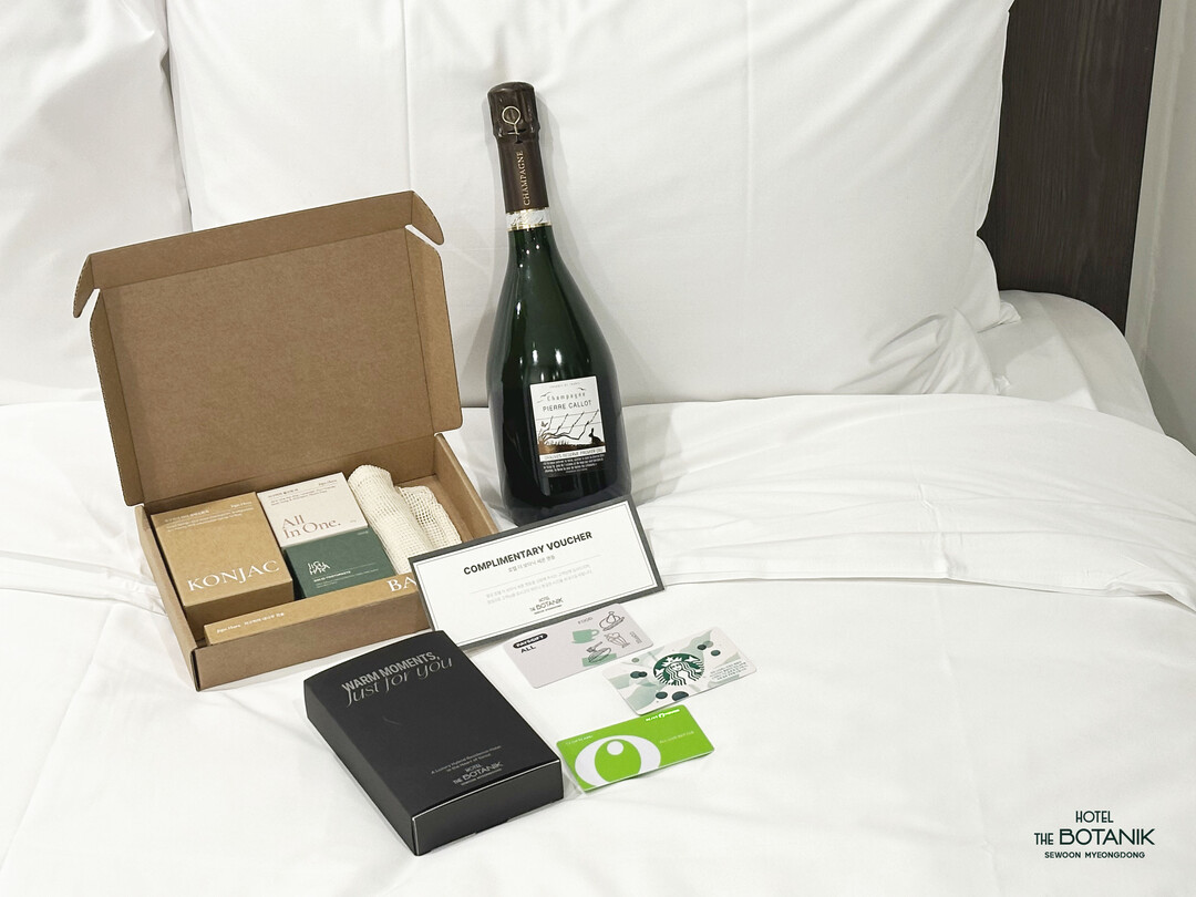 오프닝 패키지는 다양한 혜택으로 구성되어 있다. 룸 1박과 함께 무료 룸 업그레이드, 조식 2인, 레이트 체크아웃(오후 2시)이 제공되며, 여기에 신의 물방울 3권에 소개된 12만 원 상당의 피에르 깔로, 그로브 리저브 1er 크뤼 리저브 블랑 드 블랑 샴페인과 3만 원 상당의 제로웨이스트 욕실 키트(고체 치약 30정, 곤약 스펀지, 올인원 바, 면미누망, 뱀부 칫솔 2EA)를 함께 증정한다. 이번 패키지는 총 100객실 한정으로 제공된다.