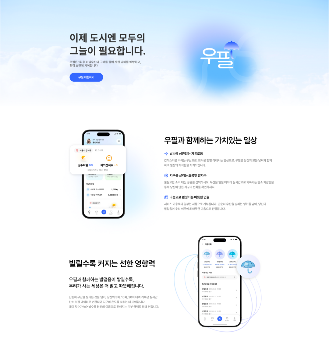 우필 프로젝트는 이러한 문제를 해결하기 위해 우산·양산 공유 플랫폼을 운영하고 있다. 비 오는 날에는 우산으로, 햇볕이 강한 날에는 양산으로 활용할 수 있으며, 자유로운 대여와 반납이 가능하다.