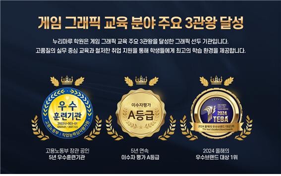 한편 누리마루학원은 수강생들에게 더 나은 수업의 질과 만족도 높은 교육과정을 만들기 위한 노력을 인정받아 중앙일보가 후원하는 2024 올해의 우수브랜드 대상 1위에 선정되는 등 게임 그래픽 분야 선도훈련기관으로 자리매김하고 있다.