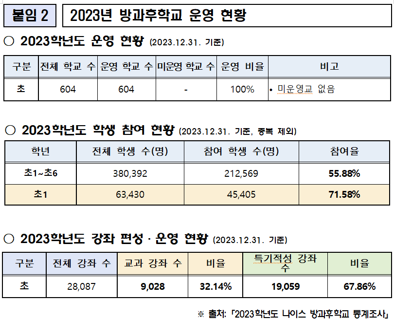 2학기에는 전국 모든 초등학교에서 늘봄학교를 운영할 예정이어서, 전면 실시를 앞두고 프로그램 운영 공간 개선 및 학년 연구실을 지원하기 위한 약 440억원의 예산을 추가 확보하여 지원할 계획이다.