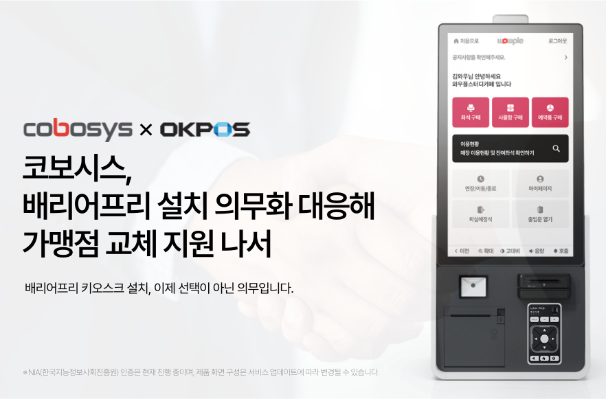 유·무인 운영 플랫폼 전문개발사 코보시스(대표 정재형)는 ‘배리어프리(Barrier-Free) 키오스크 설치 의무화’에 대응해, 기존 가맹점과의 상생을 위해 OK포스와 전략적 협업에 나섰다.
