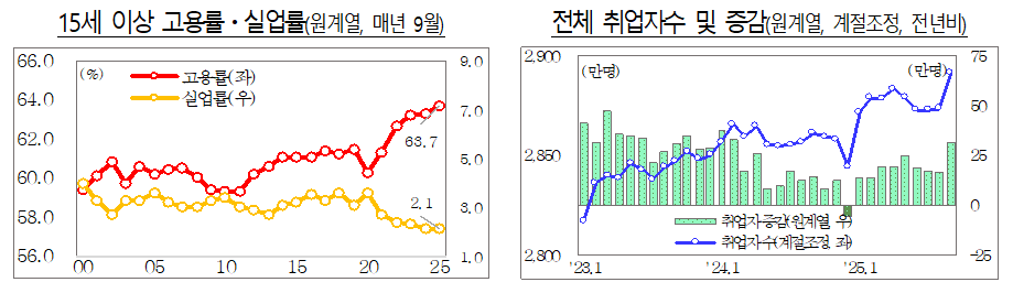 [피앤피뉴스=마성배 기자] 2025년 9월 우리나라 15세 이상 고용률이 63.7%를 기록하며 전년보다 0.4%p 상승, 9월 기준 역대 최고치를 경신했다.