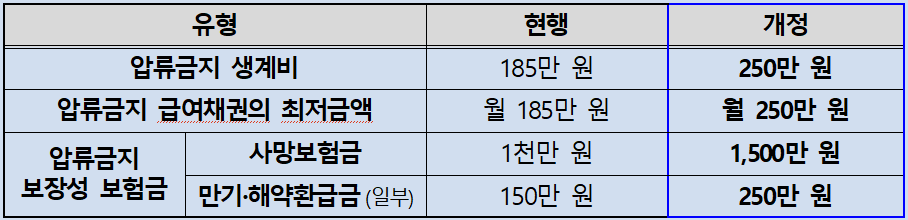 급여채권의 압류금지 최저금액 역시 현행 185만 원에서 250만 원으로 상향된다. 저소득 근로자 생활보호 효과가 늘어날 것으로 예상된다.