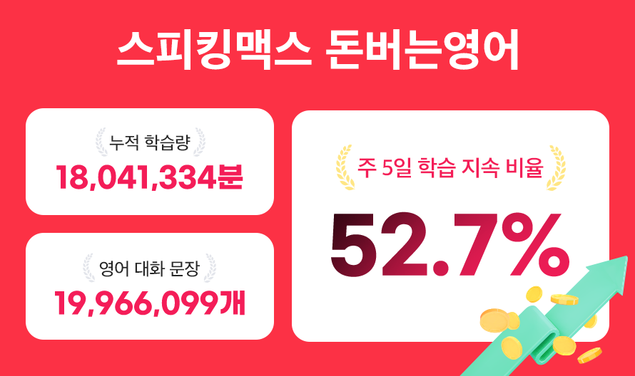 ‘스피킹맥스 돈버는영어’ 출시 이후 누적 학습량은 총 18,041,334분이며, 1:1 영어 회화를 진행하며 학습자가 영어로 대화한 문장은 총 19,966,099개다.