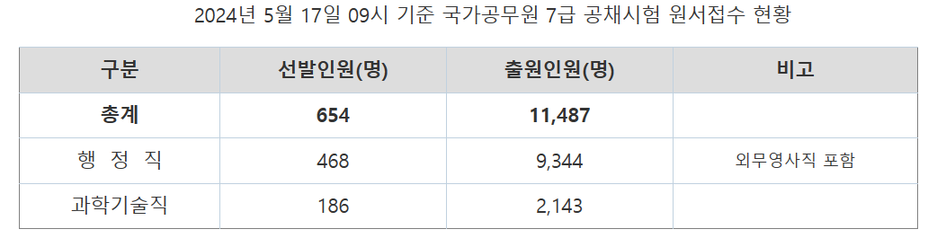 원서접수 첫날인 16일에는 행정직 6,617명, 과학기술직 1,535명 등 총 8,152명이 지원했다. 둘째 날인 17일 오전 9시 기준으로는 행정직 9,344명, 과학기술직 2,143명 등 총 11,487명이 접수됐다.