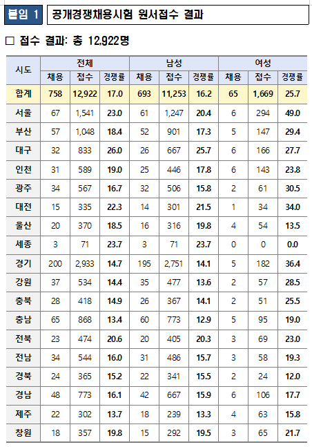 모집 분야별로는 공개경쟁채용시험은 최종 758명 선발에 12,922명이 지원하여 17.0대 1의 경쟁률을 보였다.
