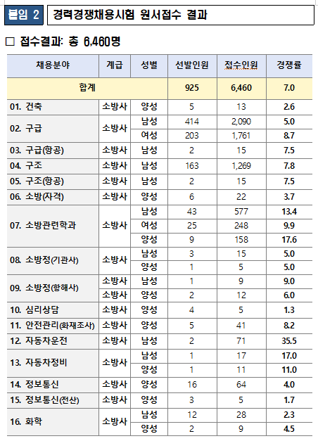 경력경쟁채용시험에는 925명 선발에 6,460명이 출원해 7.0대 1의 경쟁률을 기록했다.