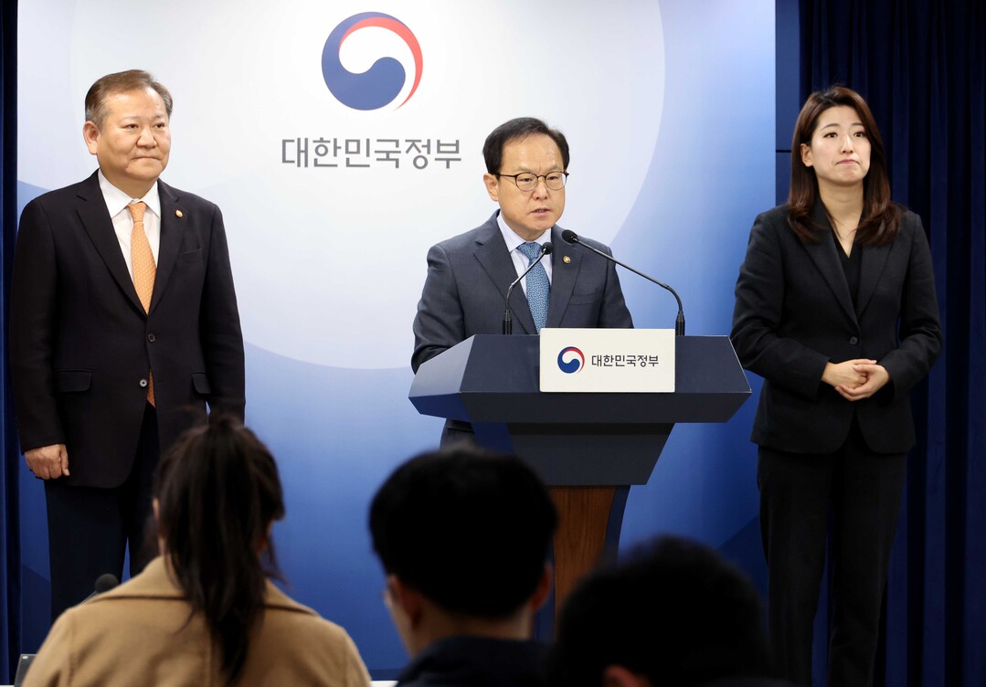 <김승호 인사혁신처장이 3월 26일 서울 종로구 정부서울청사에서 이상민 행정안전부 장관과 함께 공무원 업무집중 여건 조성방안에 관한 브리핑을 하고 있다.>