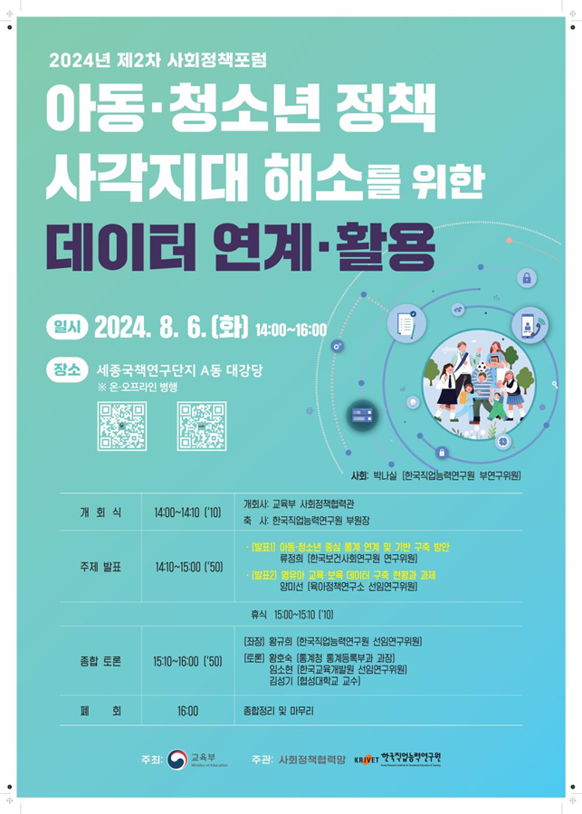 이번 토론회는 ‘아동·청소년 정책 사각지대 해소를 위한 데이터 연계·활용’을 주제로 하며, 사회정책협력망 국책연구기관들과 함께 영유아, 아동, 청소년 관련 데이터 현황을 분석하고 정책 사각지대 해소와 과학적 정책 수립을 위한 기관 간 데이터 공유 및 협업 방안을 모색한다.