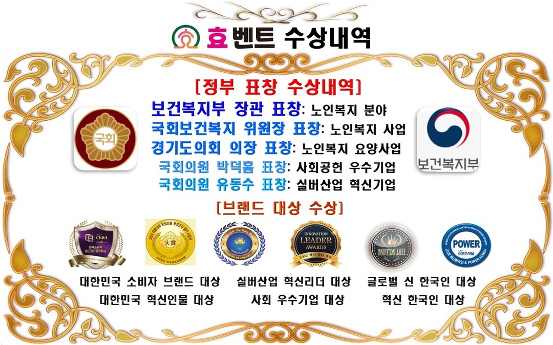 효벤트 장석영 대표는 숭실사이버대학 요양복지학과 교수 및 김포대학 사회복지전공 교수를 겸하면서 후학 양성 및 고령친화산업 분야의 정보를 제공하고, 청년일보 칼럼니스트, 한국보건복지인재원 치매케어 강사, 대한치매협회 화성지부장, 경기도 촉탁의사 협의체 위원 등 노인복지 분야 다양한 활동과 공로를 인정받아 작년 경기도 의회 의장 표창과 보건복지부 상임위원장 표창에 더하여 올해에는 노인복지 분야 선두자로써 보건복지부 장관 표창까지 수상했다.