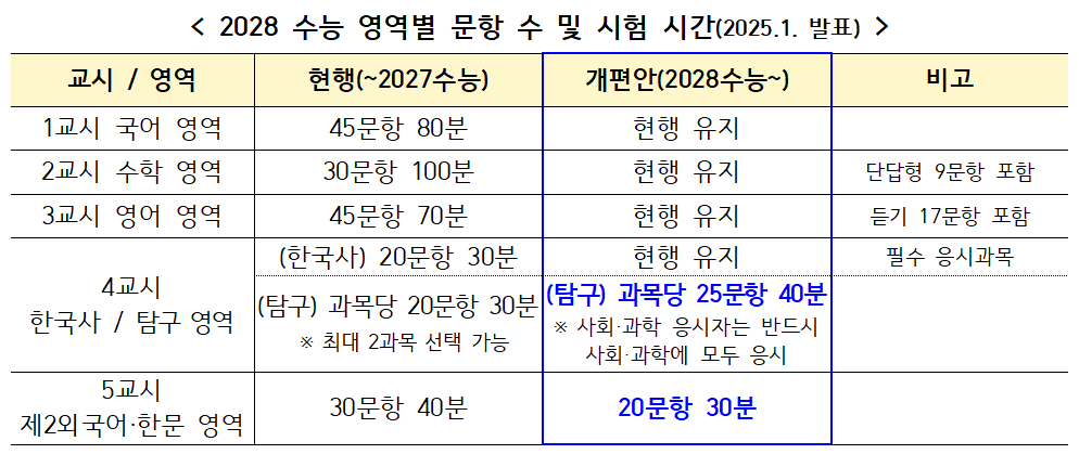 교시별 문항 수와 시험 시간은 일부 조정된다. 국어는 45문항, 수학은 30문항(이 중 30%는 단답형), 영어는 듣기 포함 45문항, 한국사는 20문항이며, 사회·과학탐구 영역은 과목당 25문항씩 40분간 진행된다.