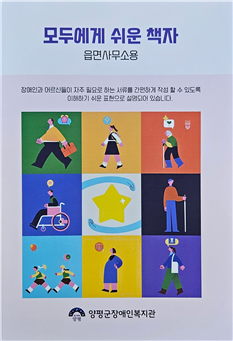 [피앤피뉴스=마성배 기자] 양평군장애인복지관(관장 김성민)은 ‘모두에게 쉬운 책자(읍면사무소용)’를 제작해 양평군 내 12개 읍·면사무소에 배포했다고 지난 11일 밝혔다.