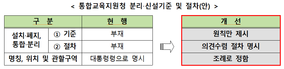 다음으로, 교육지원청의 관할 구역과 명칭·위치를 대통령령으로 정하던 기존 방식을 개선해 시도교육청이 조례로 정할 수 있도록 권한을 이양한다. 이에 따라 각 지역의 교육감은 지방의회, 주민, 학부모 등의 의견을 수렴해 교육지원청의 설치·폐지·통합·분리를 결정할 수 있게 된다. 이를 통해 신도시 개발로 인한 교육 수요 급증과 넓은 관할 범위로 어려움을 겪었던 경기 화성오산교육지원청 등 일부 통합교육지원청이 지역 주민들의 수요에 맞춰 더욱 밀접하게 대응할 수 있을 것으로 기대된다.
