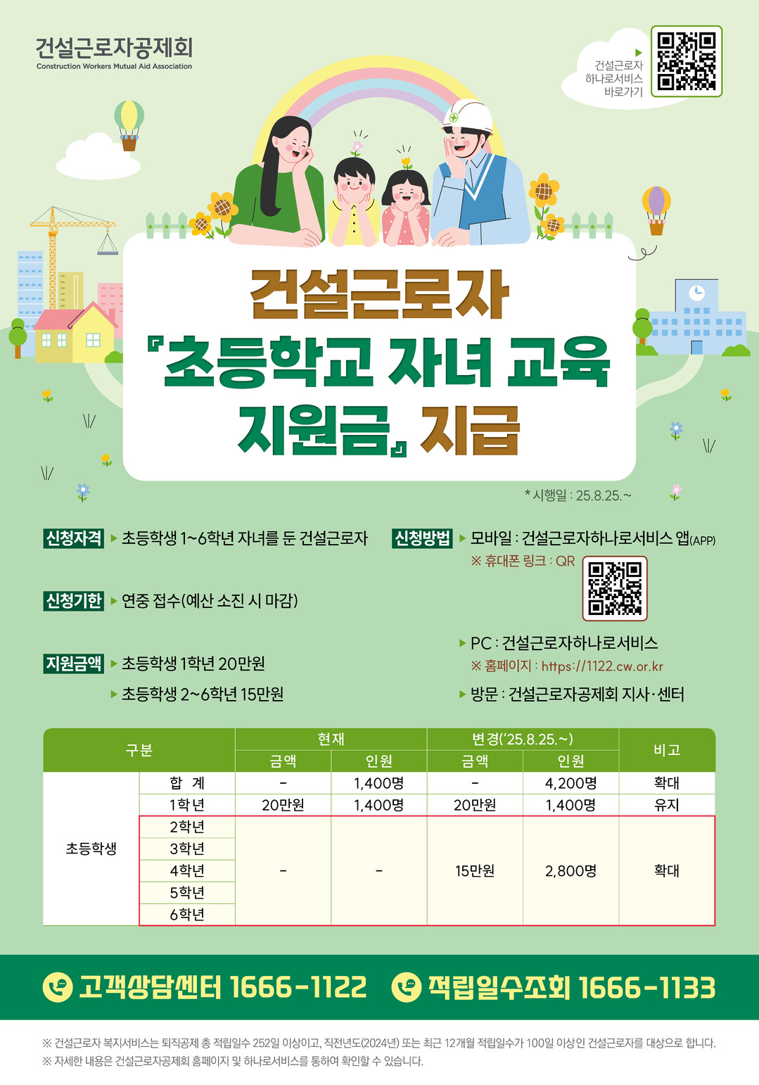 [피앤피뉴스=마성배 기자] 건설근로자공제회(이사장 김상인)가 침체된 건설경기 속에서 건설노동자의 가정 부담을 줄이기 위해 초등학교 2~6학년 자녀를 둔 근로자 2,800명에게 자녀 1인당 15만 원의 교육비를 지원한다. 총 4억 2천만 원 규모로, 선착순 신청 마감 방식이다.
