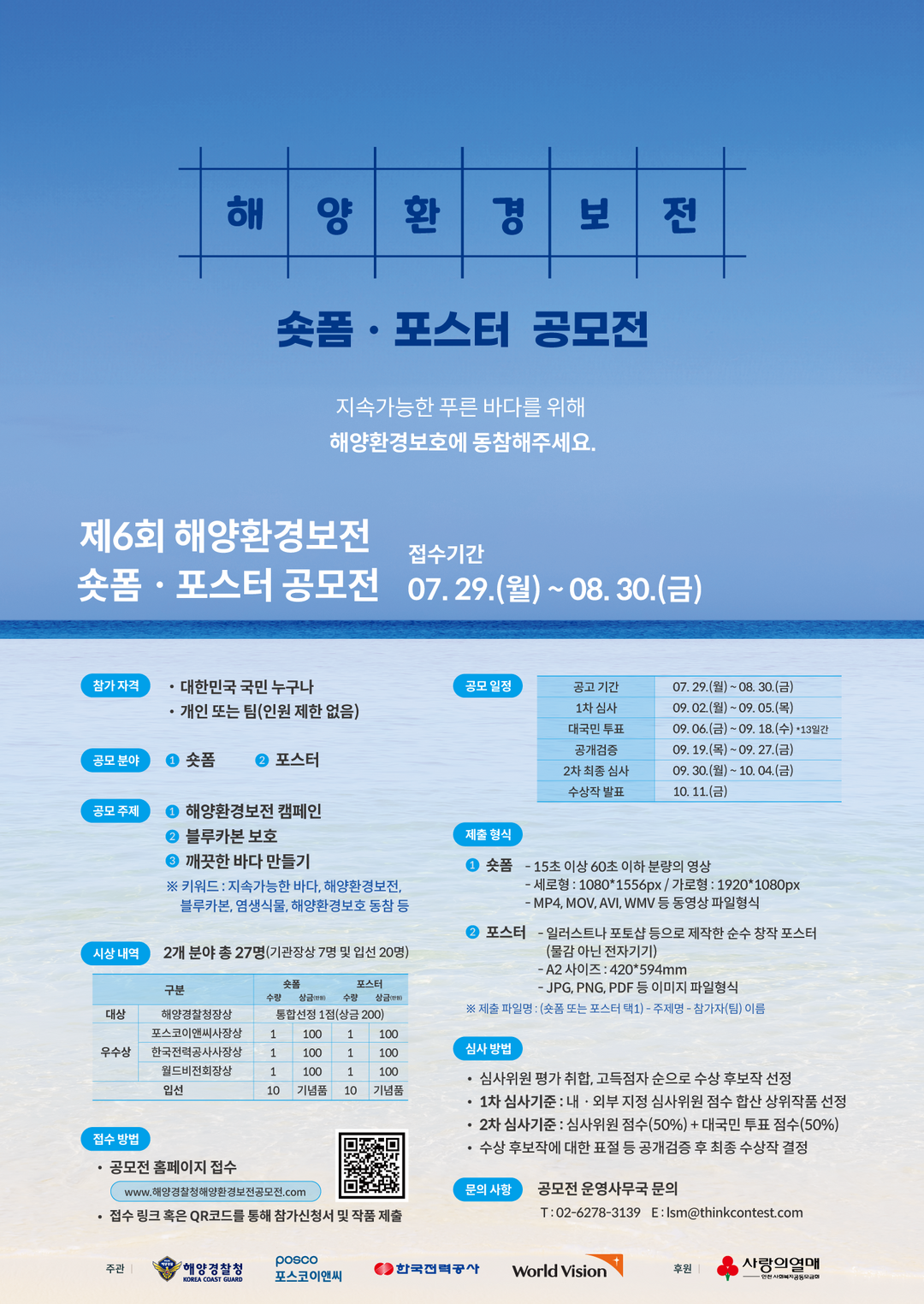[피앤피뉴스=서광석 기자] 해양경찰청(청장 김종욱)은 7월 29일부터 8월 30일까지 ‘제6회 해양 환경보전 숏폼·포스터 공모전’을 개최한다고 밝혔다.