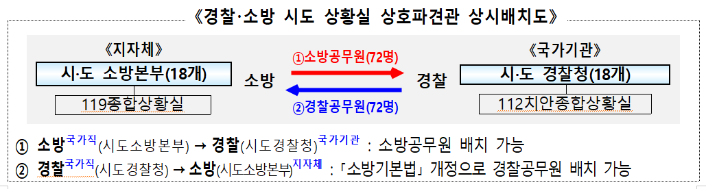 행정안전부는 7월 31일부터 경찰과 소방 상황실에 상호파견관 144명을 상시 배치하는 내용을 골자로 한 ‘지방자치단체에 두는 소방공무원의 정원에 관한 규정’과 ‘경찰청과 그 소속기관 직제’ 일부개정안을 시행한다고 밝혔다.